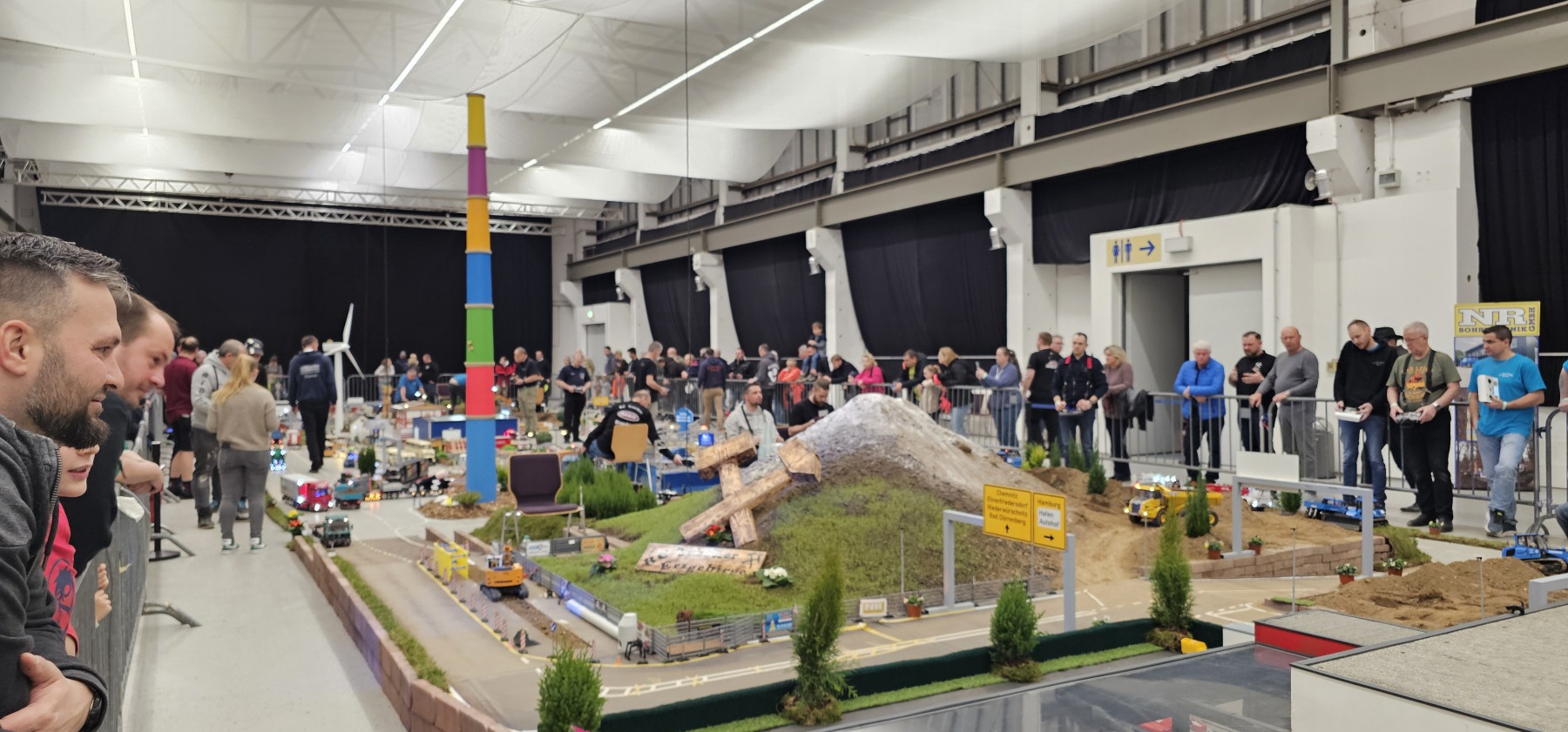 Einen weiteren anspruchsvollen Parcours präsentieren die RC Freunde Chemnitz in Halle 1. Hier kommen sechs Container mit über 50 Kubikmetern unterschiedlicher Baumaterialien, von Lehm bis Sand, zum Einsatz. Zusätzlich steht eine Teststrecke zur Verfügung, auf der Besucher selbst aktiv werden können.